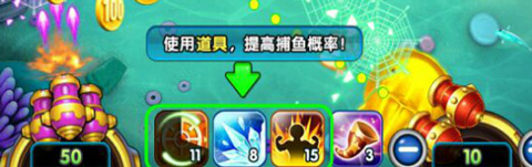 接下来是”狂暴”的道具,使用时可以使玩家的炮台的发泡速度提高100%,并”提高捕获概率”,持续10秒。