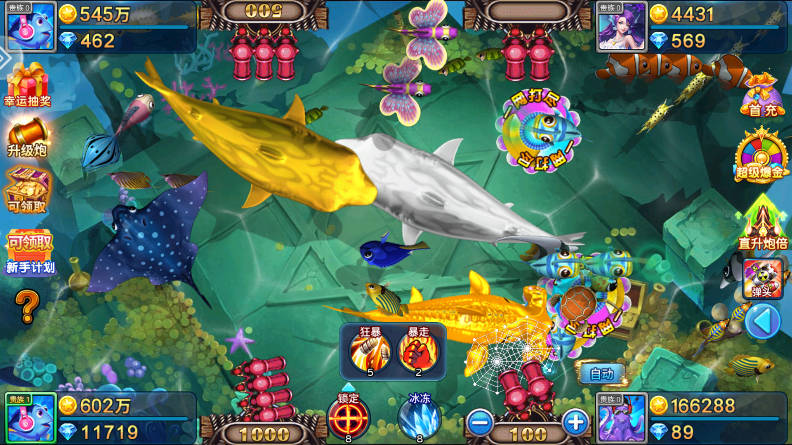 捕鱼大咖极速版除了拥有经典的捕鱼玩法模式之外还设计了很多极速版的玩法,你可以加入各种渔场快速的体验各种捕鱼模式,当玩家累积了一定的金币和经验後,就可以进入高级渔场。这里的鱼类种类更多,倍率也更高,同时会出现一些特殊鱼种,如大三元、大四喜等,捕捉后能获得额外奖励。