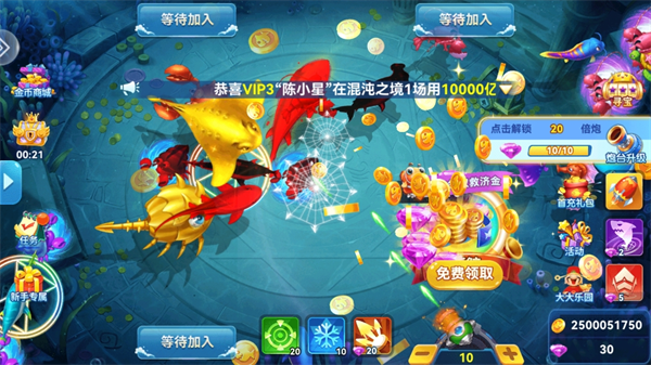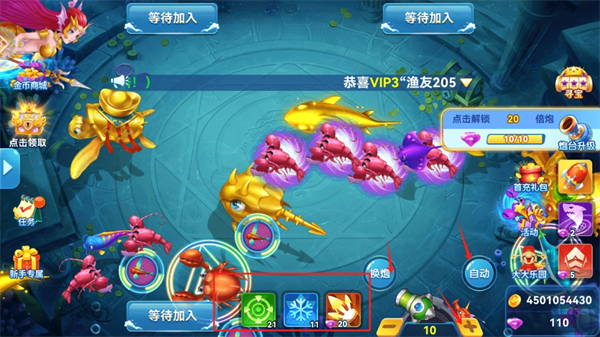 5.在游戏内可以开启自动模式还没换炮,加大倍数更有多种道具帮助你更好的捕捉到大鱼。