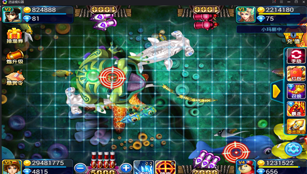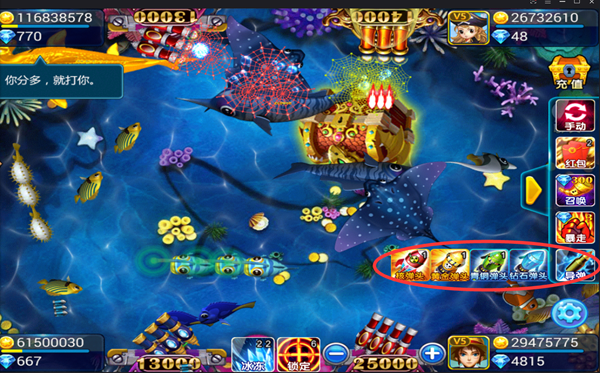 3、使用弹头打BOSS鱼可以一击必中,青铜弹头可以获得27万左右金币、黄金弹头110万左右金币、核弹头225万左右金币。打死美人鱼有一定机率掉落弹头,打死宝藏船必掉落弹头。