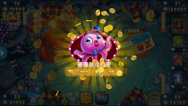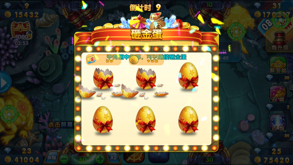 怎么样才可以触发"金蛋"小游戏呢?首先玩到一定的时间,鱼池里会随机出现颗金光闪闪的蛋,金蛋和摇钱树不一样,摇钱树的防御强,要很多炮才能打下来,而金蛋的防御比较弱,所以当它一出现在视线中的时候就要一直开炮,运气好的话就相当于直接送给你.