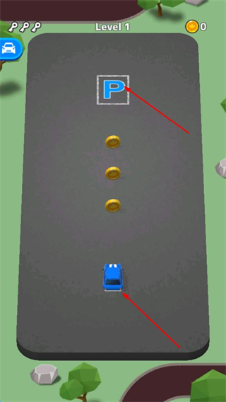 1、点击进入游戏关卡内,观察金币位置与停车位,规划蓝色路径,让车沿金币轨迹行驶,精准停入车位。
