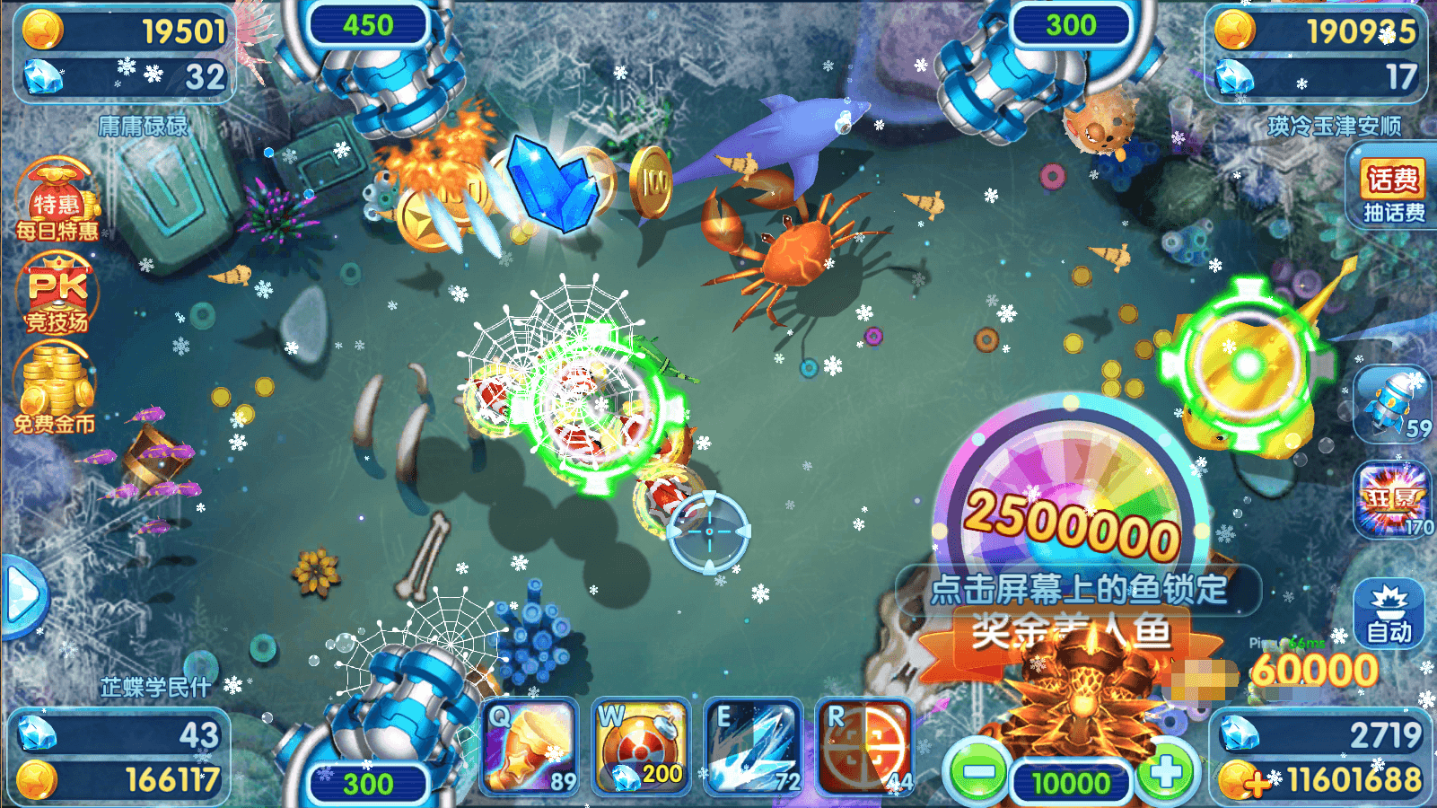 首先声明,该图为群内玩家友情赞助,真是看的我心潮澎湃啊,10000倍炮看起来那是相当的刺激,游戏内有多种技能,除开最基础的冰冻、锁定、回音螺之外,还有几个相当实用的技能,以下介绍摘自游戏内