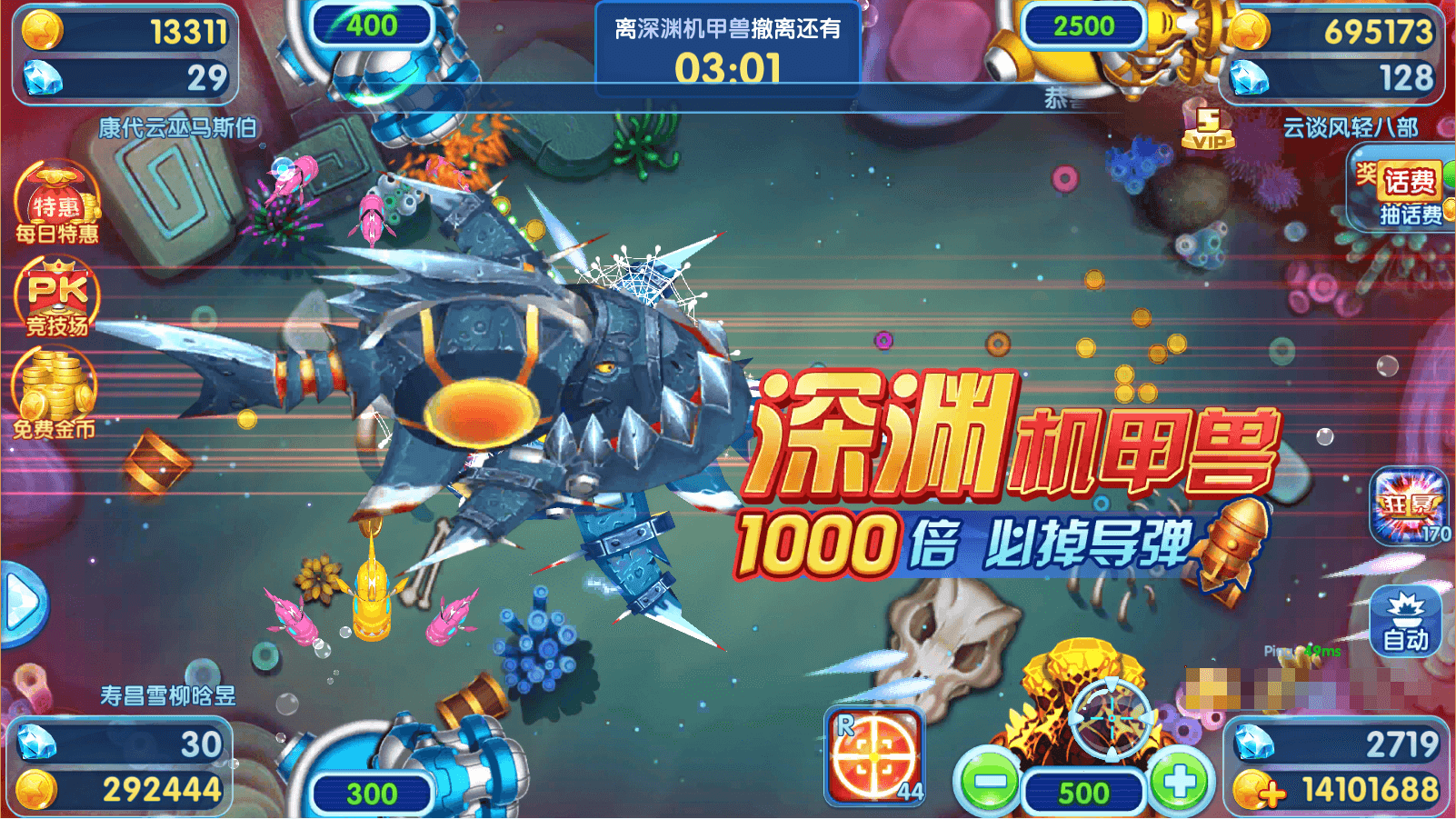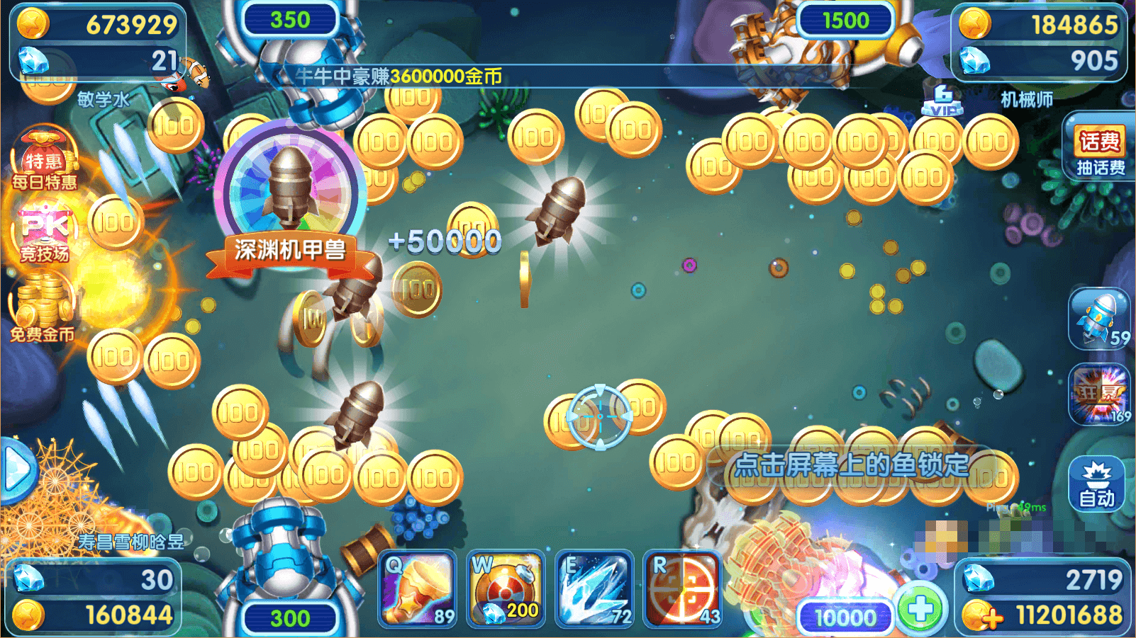 目测这个BOSS应该是游戏内最高的BOSS了,心里大概估算一下,10000倍的炮捕获了它的话,那可是1000万啊,并且给的不是金币,是导弹啊,自己没金币的时候可以用导弹吸引一下别人的眼球,但是自己如果不缺金币的话,导弹就可以赠送给其他玩家了,当然不是免费赠送的哦,至于是哪种方式?你懂得!!!